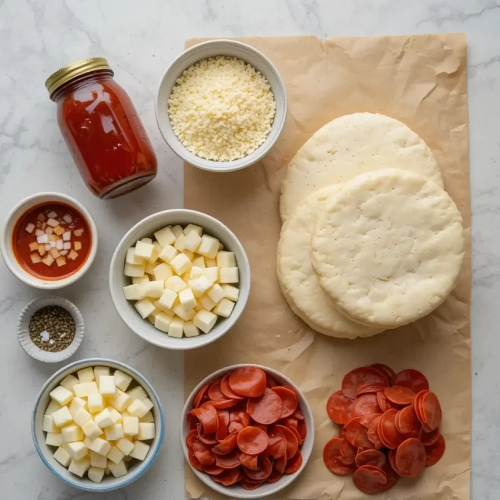 - Flatten each piece of dough into a circle. Place 2–3 slices of pepperoni, a spoonful of pizza sauce, and a sprinkle of mozzarella in the center.